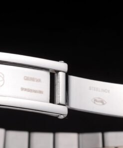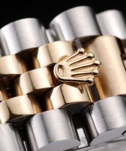 Bracelet de acero inoxidable: Acero Dos brazalete de eslabones de tonos de acero inoxidable cepillado y oro amarillo de 18K plateado con Rolex grabado cierre oculto mostrando la longitud Rolex logo