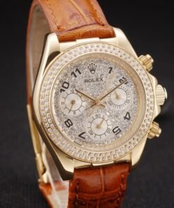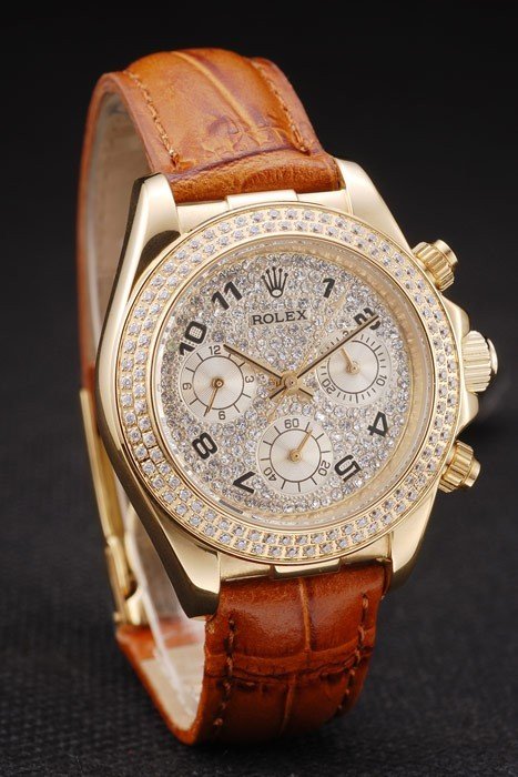 Crown: 18k corona amarilla calado de oro con el logotipo de Rolex y dos botones pulsadores cutwork coronas más pequeñas a cada lado de it